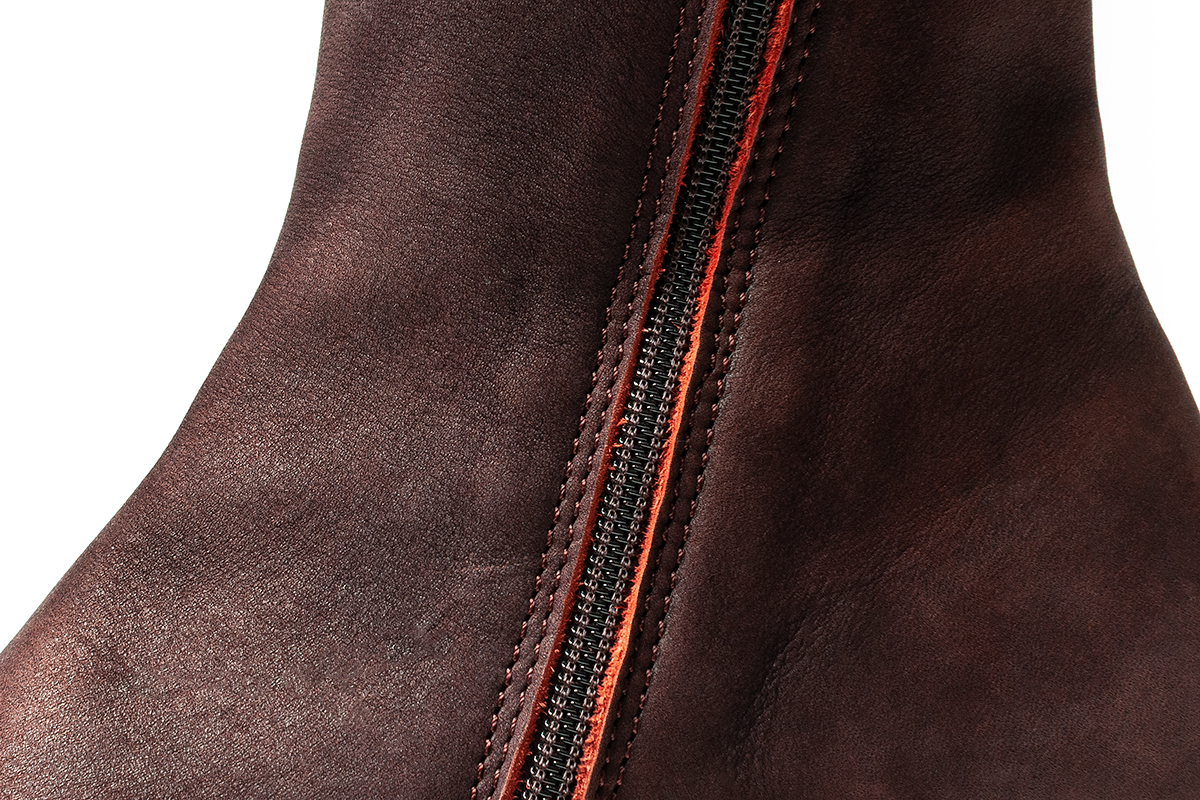 クロムなめしのヌバックレザー。タンブル加工後にオイル仕上げ。非常に柔らかな感触と、なめらかな表面が特徴です。素材の特性として薄くむら感が出る場合があります。