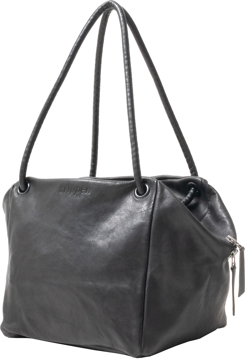 ”立方体”から着想を得たバッグ。一本のチューブストラップをボディのアイレットに通してハンドルやストラップとして使用します。チューブストラップは、結び目の位置で長さを調整出来ます。ショルダーバッグだけでなくバックパックとしても使用できます。