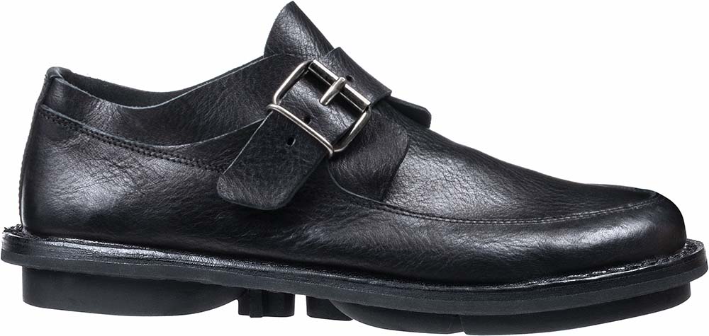 クラシックなユニセックスのローシューズ。甲にシンプルなバックルがついています。