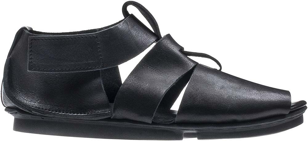 サイドにベルクロがついたクラシックなサンダル。長いブリッジと四角く並べられたパーツが織り込まれ、建築的な印象です。