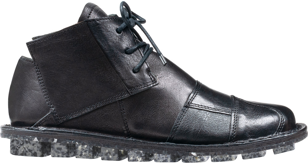 さまざまな残革を組み上げて成型した実験的な一足。レーズやジッパー、ゴムなど素材によって表情が変わります。