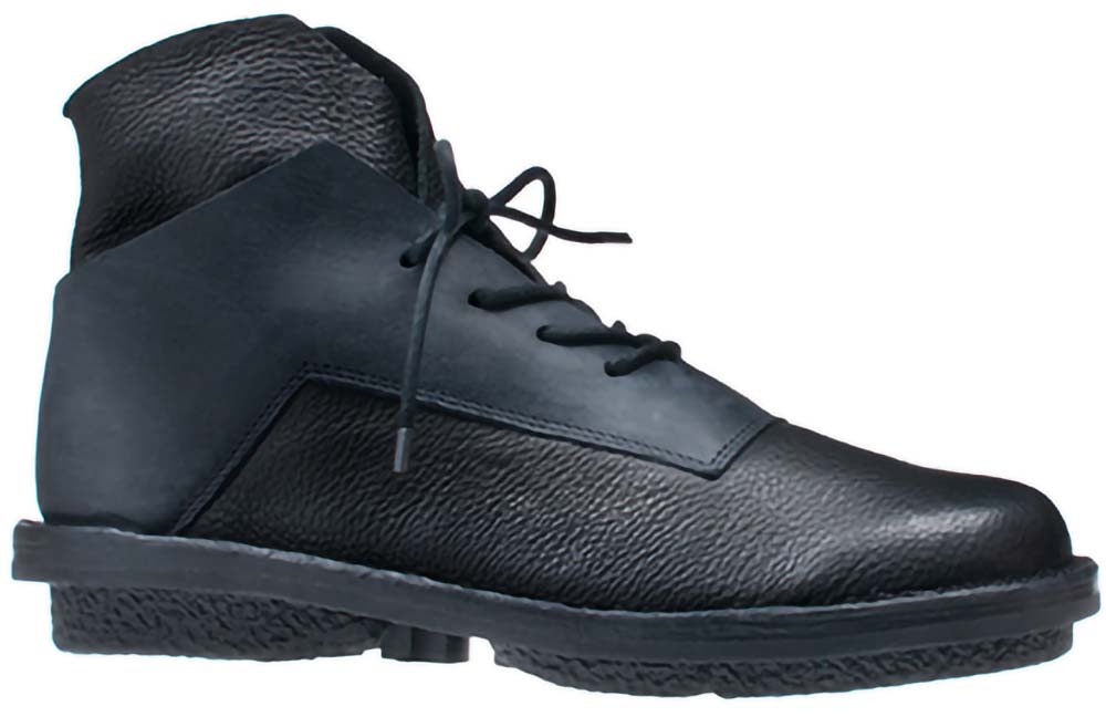 ユニセックスなショートブーツ。サイドに重なるレザーがグラフィカルなラインと魅力的なコントラストを生み出しています。