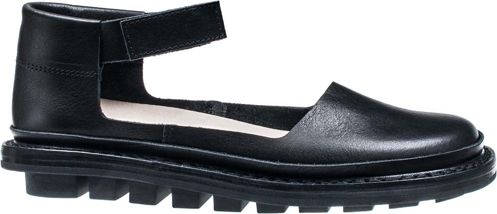両サイドが大きく開いたバレリーナシューズ。くるぶしを一周するベルクロストラップにより、安定感のある履き心地です。