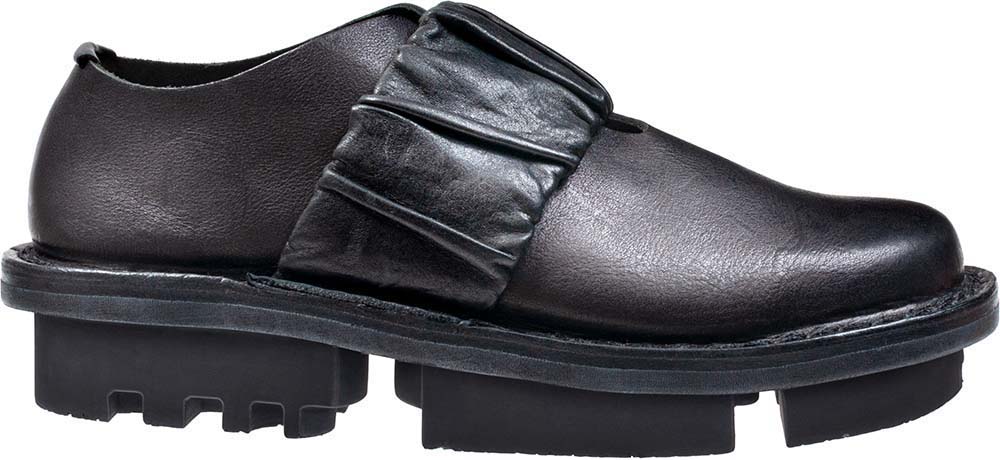 革でくるんだ幅広のゴムが甲を渡っている、シンプルなスリッポンシューズ。