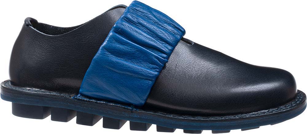 革でくるんだ幅広のゴムが甲を渡っている、シンプルなスリッポンシューズ。