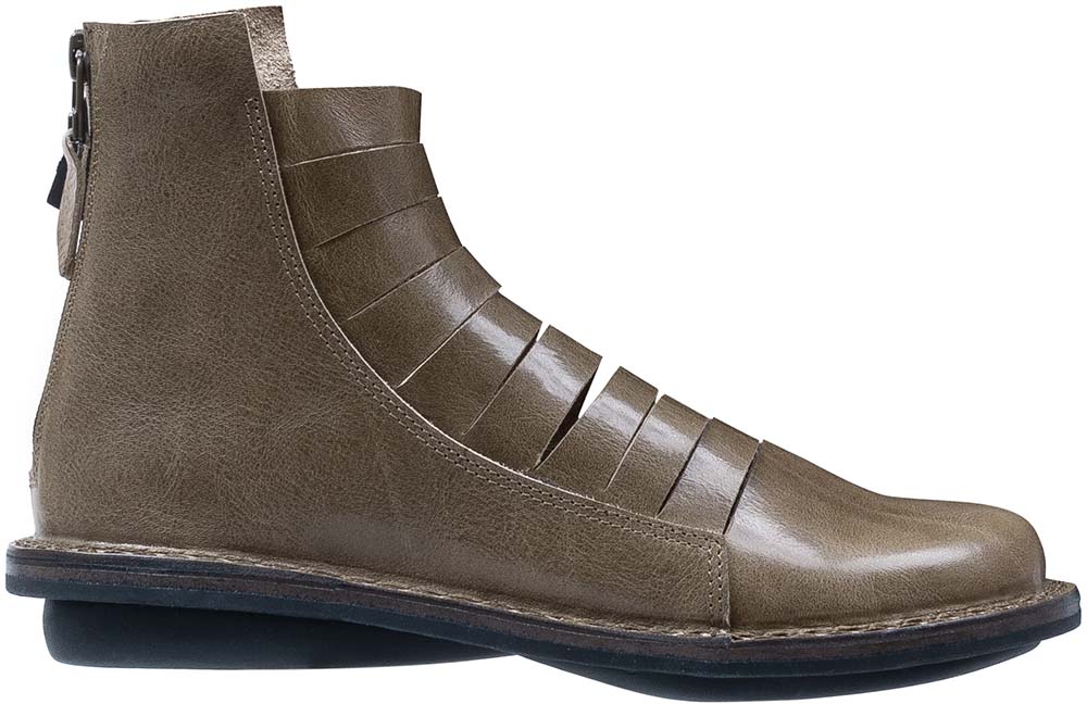 踵にファスナーのついたユニセックスの夏用アンクルブーツ。アッパーレザーは水平に切り込みが入り、甲に沿うよう作られています。マリンのイメージです。