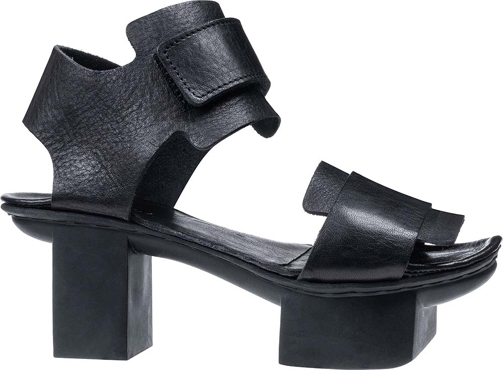 シンプルで機能的なサンダル。2本の幅広のベルクロストラップには長方形のパーツが重なり、建築的な印象です。