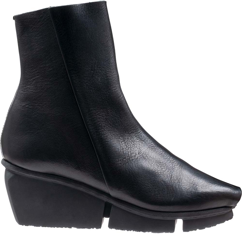 折り込まれたつま先から展開したアンクルブーツ。後ろの中央には断続的な縫い目があり、下から覗く対照的な色が特徴的です。