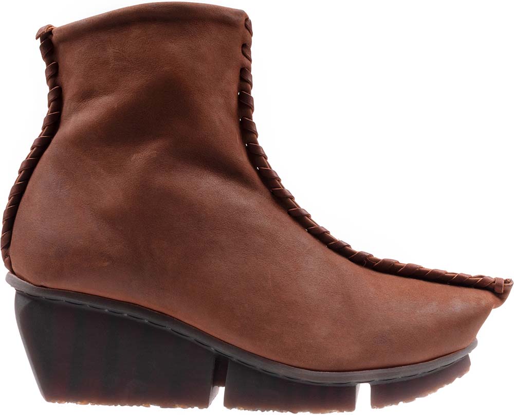 幅広の装飾的な縫い目が中央にあるアンクルブーツ。つま先へ向かって尖っており、2つに分かれたパーツをレザーストラップでつなぎ合わせています。裏地付き。