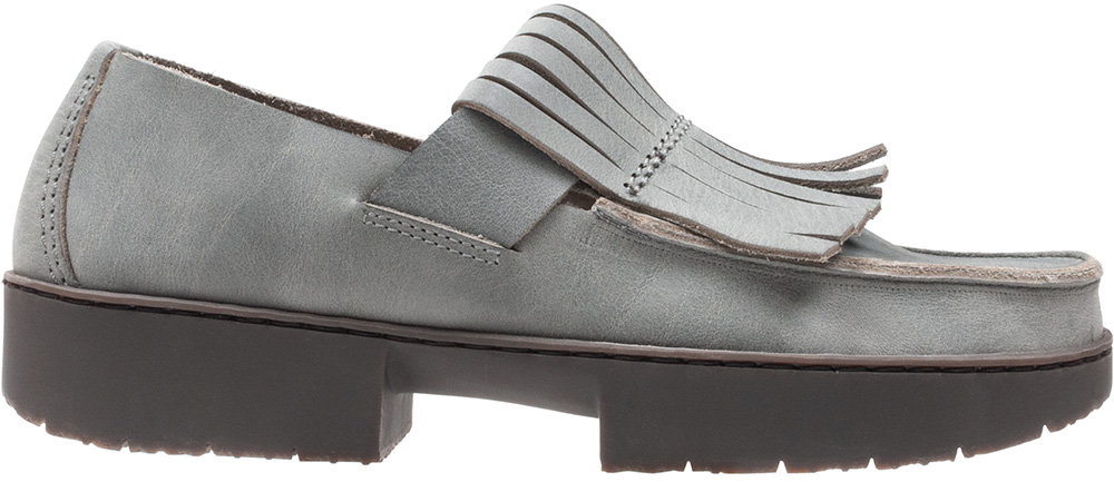 クラシックなローファーのようなユニセックススタイルで、装飾的なフリンジの装飾が施されています。フリンジの下には甲を横切るようにゴムが通っています。