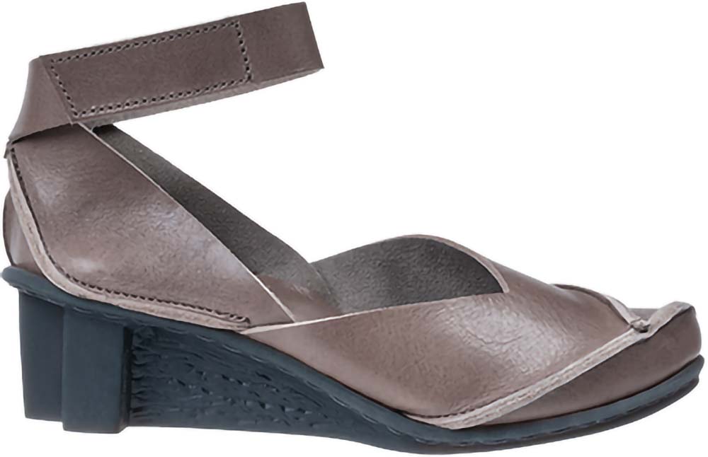 アシンメトリーなトップラインとベルクロのアンクルストラップを備えた、クラシックなパンプス。