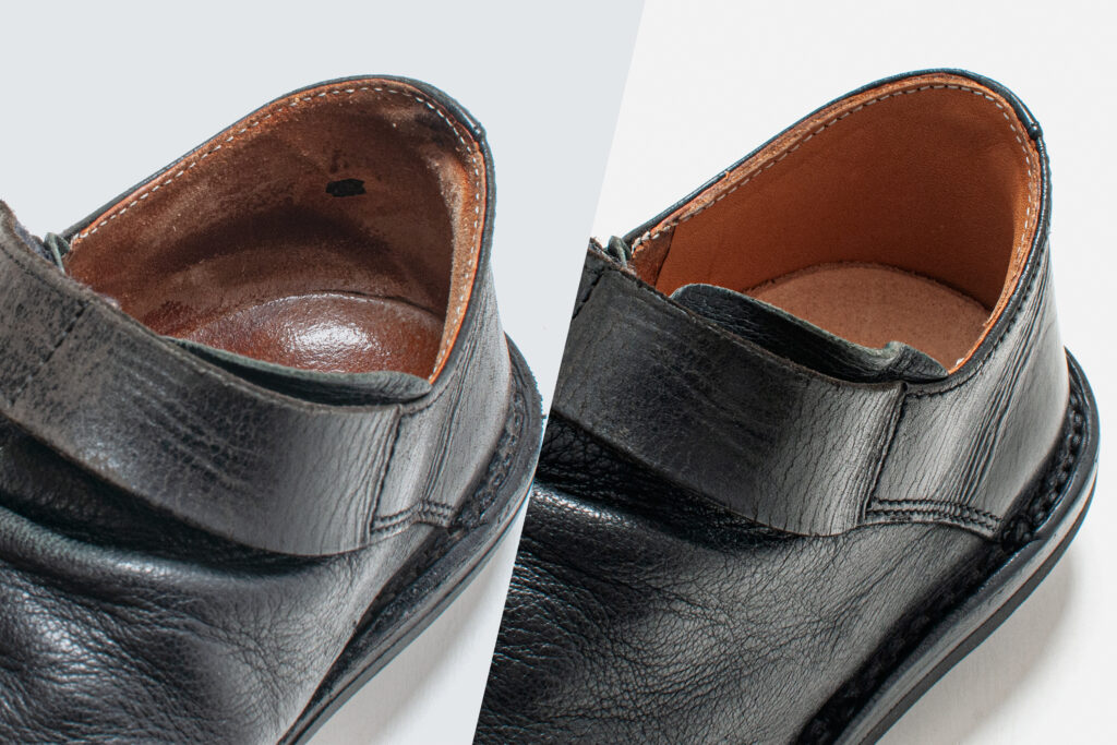破れたり、薄くなったかかとの内側の革を張り替えます。革を張り替えることで強度が増して、形も再びしっかりと立ち上がります。